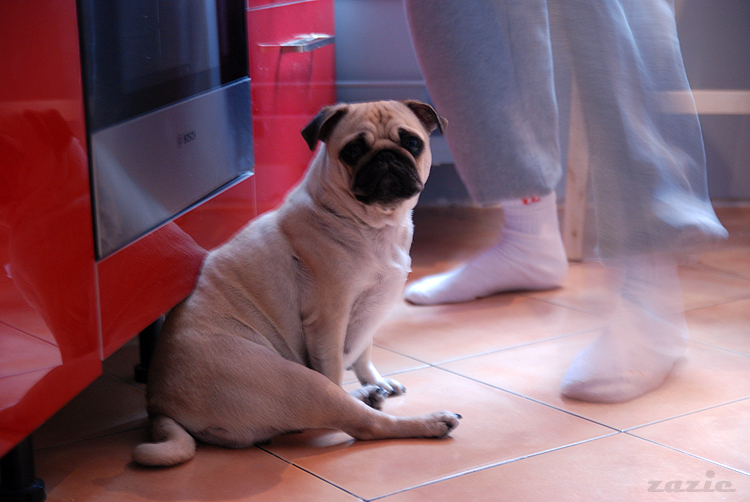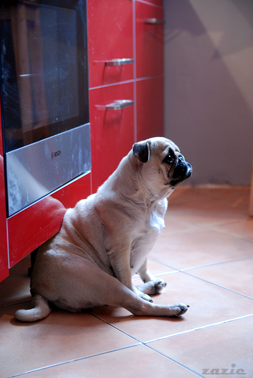 mops zaparł się pupką o kuchenną szafkę, żeby mu owa (pupka, nie szafka) nie odjeżdżała z miejsca wydarzeń.