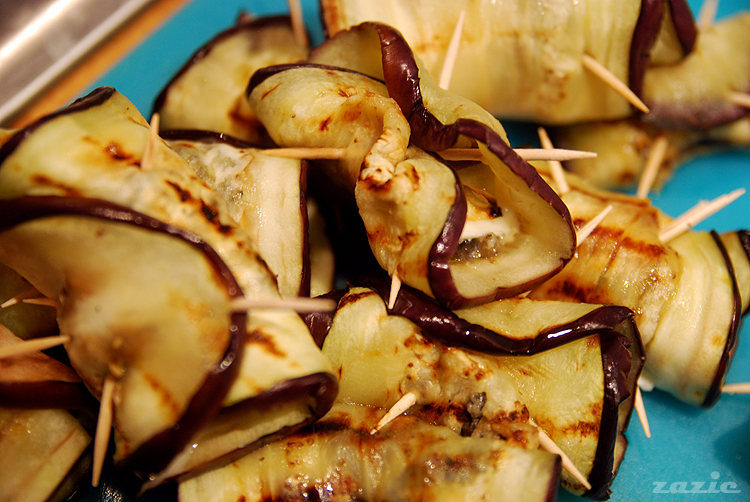 Czosnek drobno posiekać, podsmażyć na odrobinieoliwy, na koniec dodać drobno posiekane oliwki orazanchois (o ile jeszcze Zaz ich nie wpierniczyła). Przełożyć do miski i wymieszać z drobnoposiekaną bazylią. Farsz nałożyć na plasterkibakłażanów,