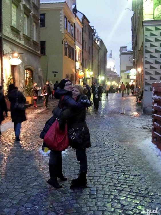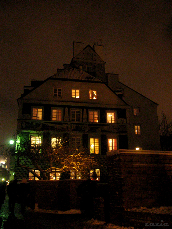 oszołomiony Quentin podziwia ośnieżone kamienice warszawskiej starówki –