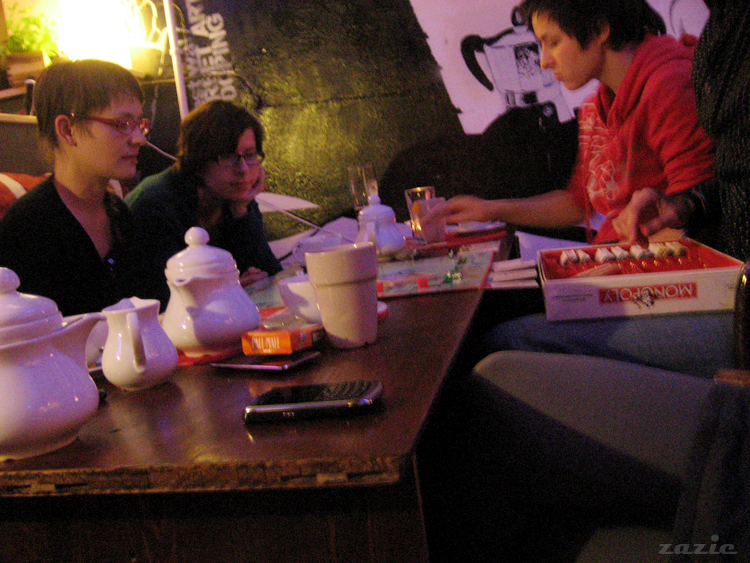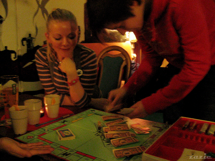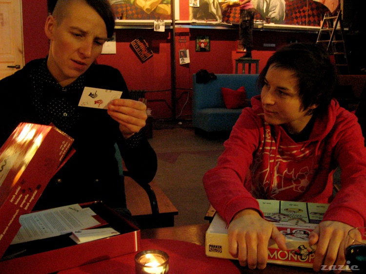 tymczasem Syd czyta pierwsze pytanie z gry planszowej "maturalny omnibus" – Emi tymczasem lobbuje za monopolem