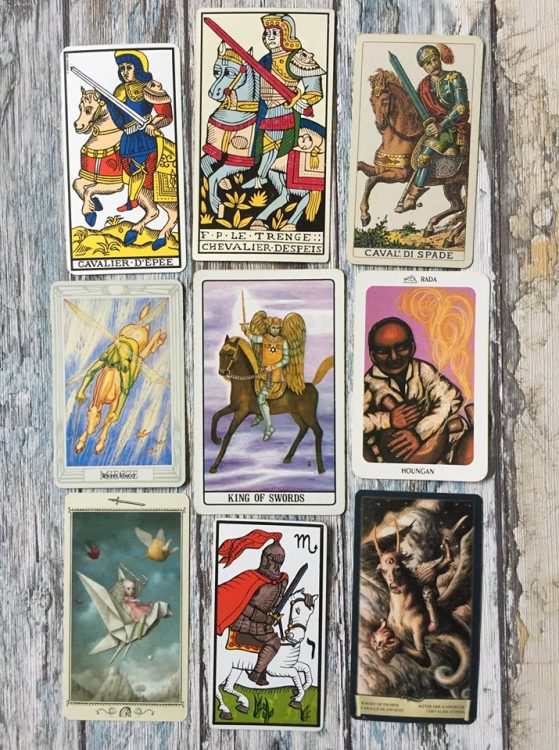Talie: Ancien Tarot de Marseille, Tarot de Marseille Jean Dodal, Ancient Italian Tarot, Tarot Thota, The Golden Dawn Tarot, The New Orleans Voodoo Tarot, Nicoletta Ceccoli Tarot, El Gran Tarot Esotérico, Dark Grimoire Tarot (uwaga: w talii The Golden Dawn Tarot odpowiednikami rycerzy z talii tradycyjnych są królowie, za to odpowiednikami królów są książęta – jest to dość mylące, ale ma uzasadnienie w naukach Hermetycznego Zakonu Złotego Brzasku)