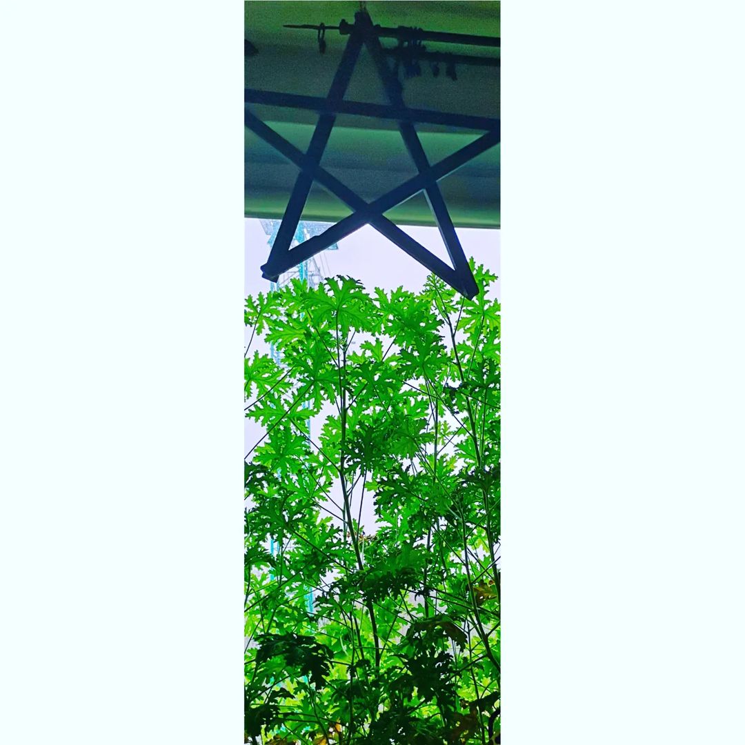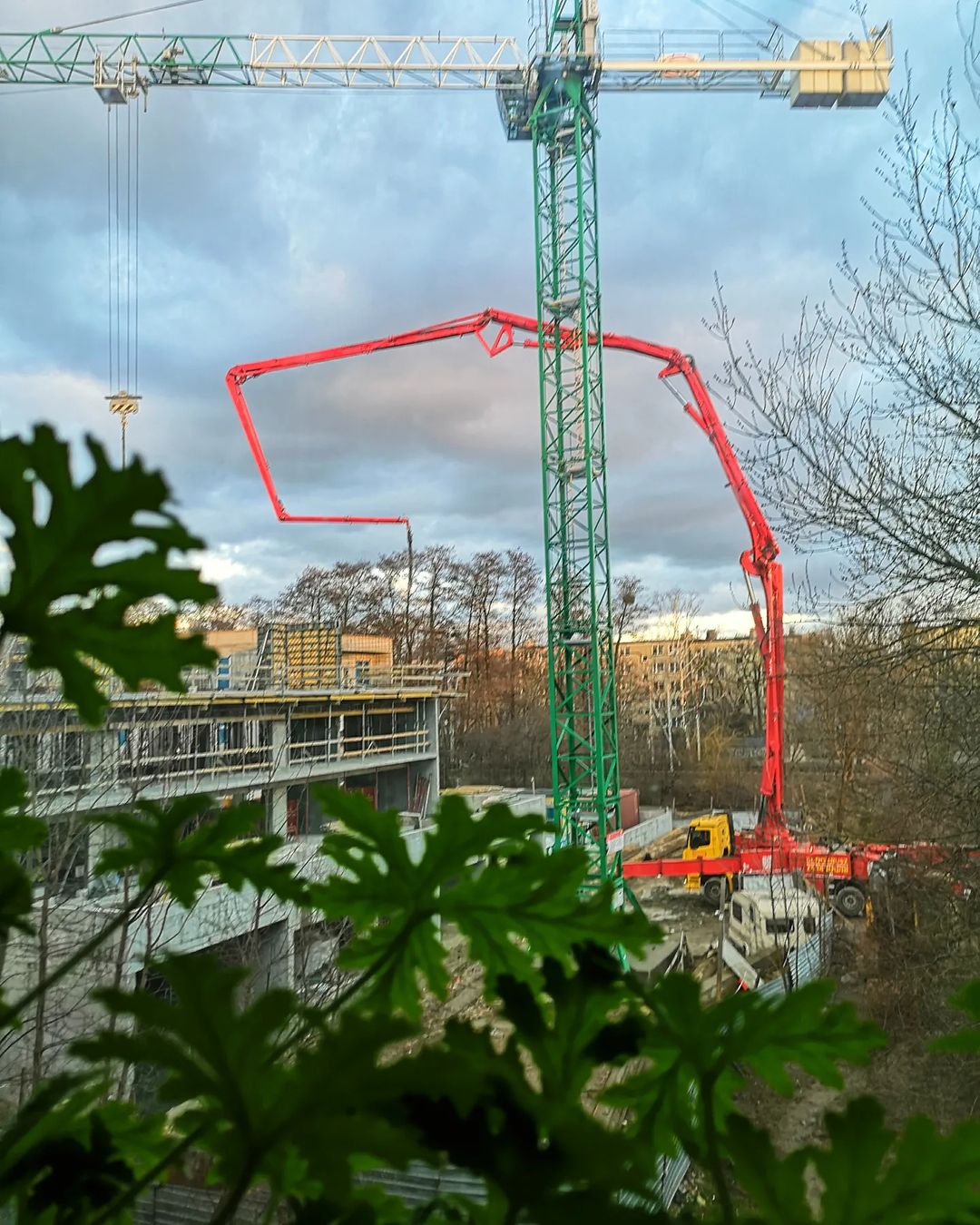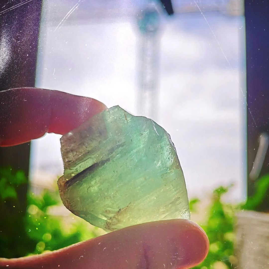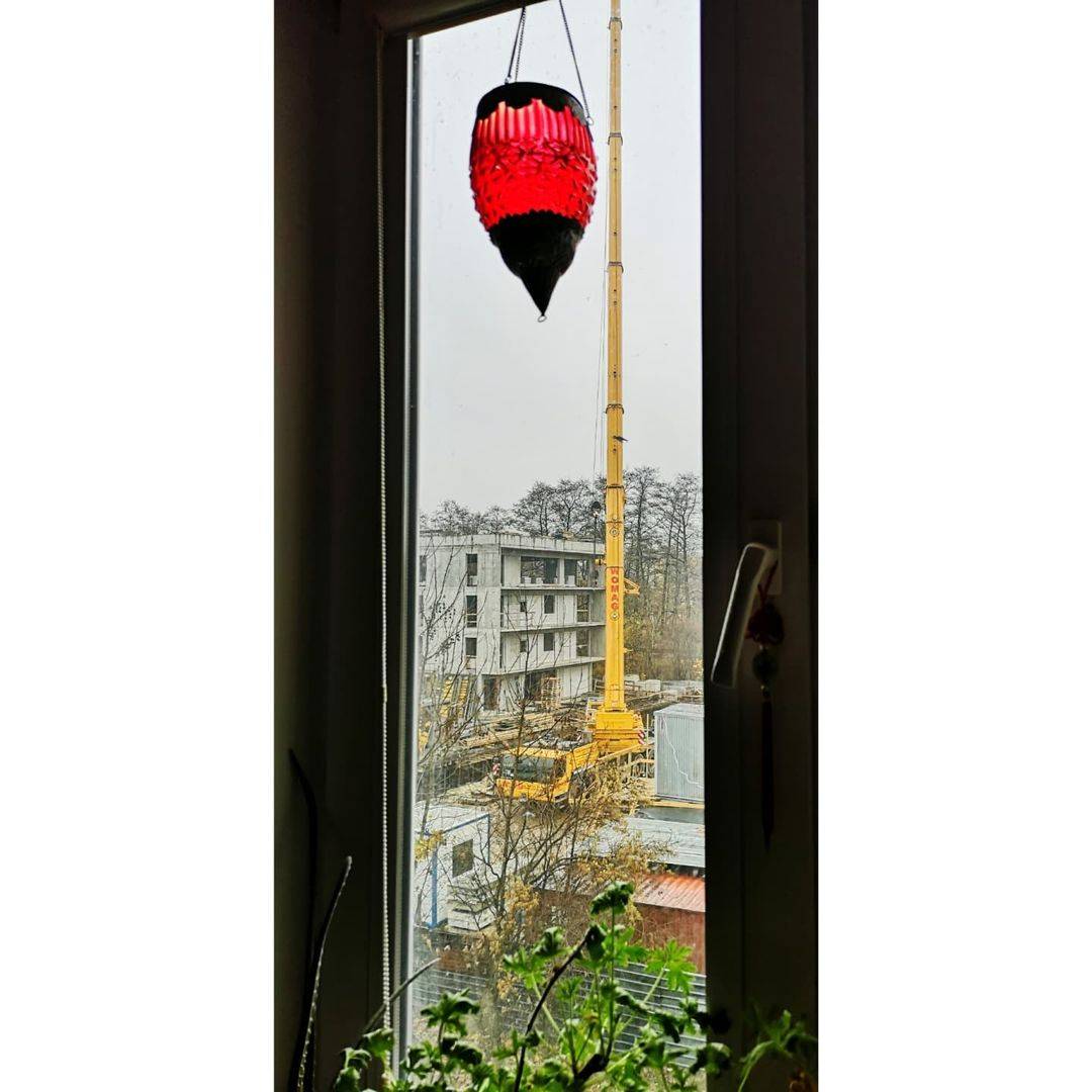 zielony kalcyt w dłoni, zielone geranium na parapecie, zielony dźwig za oknem.